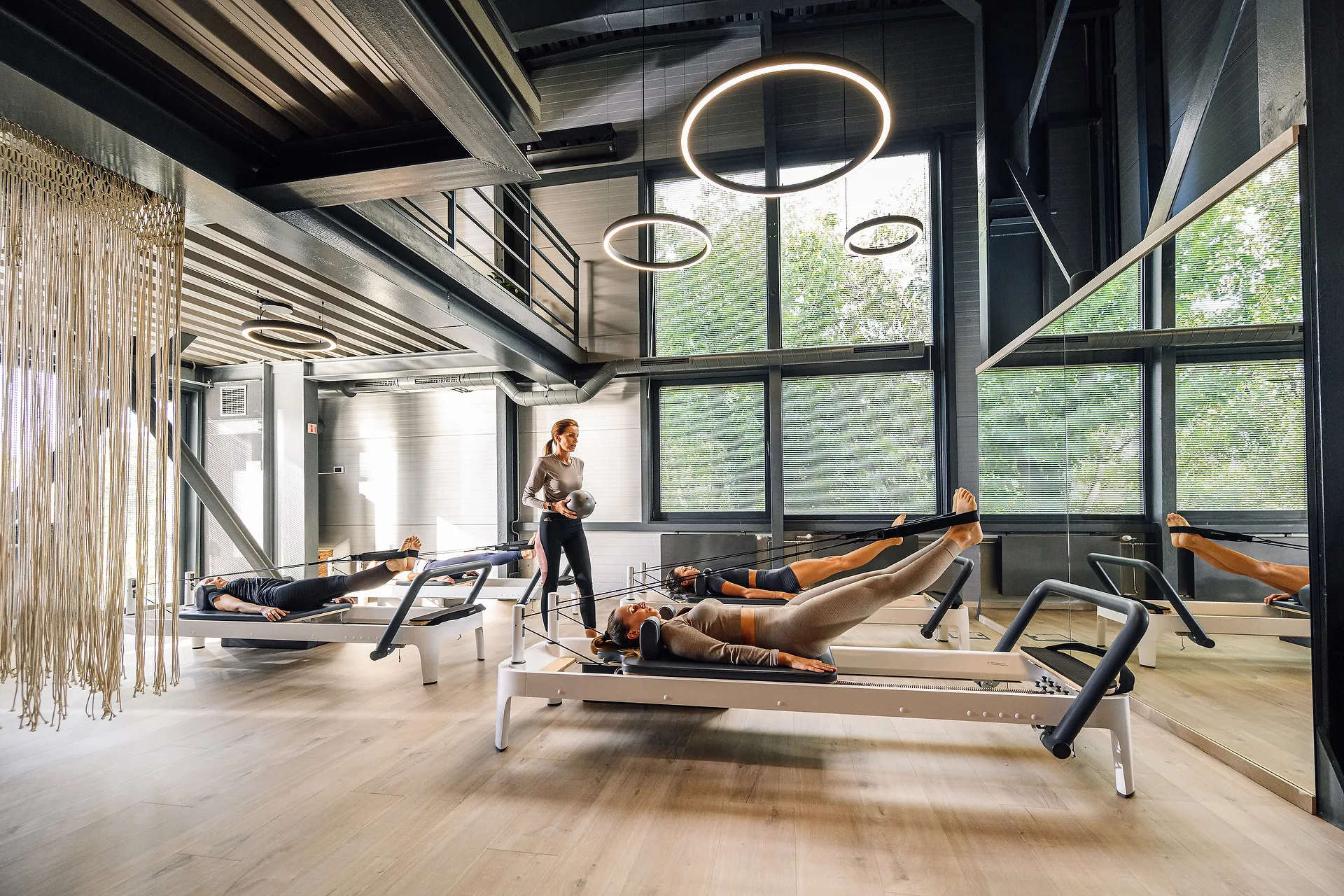 Priestranná jogová sála s rozlohou až 90 m2, menšia jogová sála na privátne lekcie, terapie a hot jogu. Pilates sála so 4 strojmi Reformer Allegro 2.